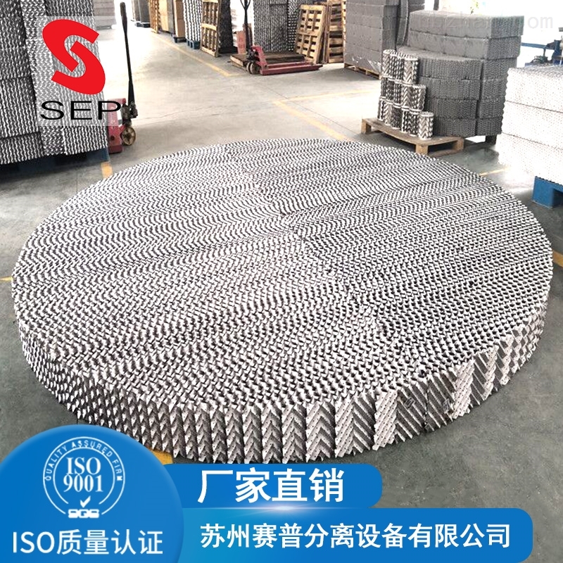 具有通量大、阻力小、效率高、抗堵能力强的优点。在精馏、吸收、萃取等单元操作中广泛应用。根据填料型号,MIN塔径为80-200MM,MAX直径已达13M,液体喷淋密度可从0.2-200M3/(M2·H),应用于负压、常压和加压操作。产品出产工艺:在金属薄板孔面打孔、轧制小纹、大波纹终拼装而成,具有阻力小,气液散布均匀,功率高,能量大,扩大效应不明显等特点,使用于负压常压和加压操作。