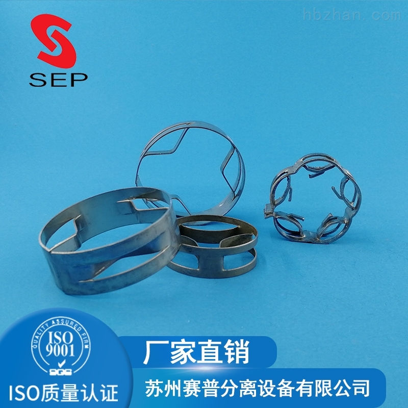 扁环填料目前有三种型号,即内弯弧形筋片扁环填料(HQ-1)、梅花扁环HQ-2,带齿扁环HQ-3.材质有304、321、316、316L等。金属扁环特点是对称均匀的内弯弧形筋片能促进液滴群的分散-聚会-再分散的循环过程,有效降低填料层内返混,从而液液两相间传质性能。