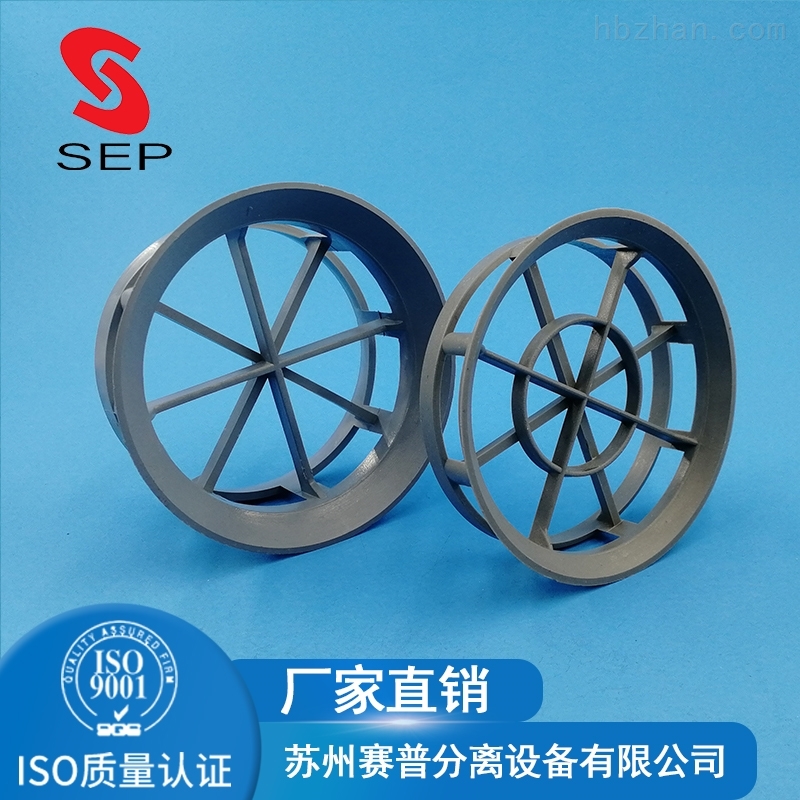 塑料阶梯环填料又由于翻边的影响,使得填料在堆积时填料环隙之间的接触由此线性接触为主变为以点接触为主。这样,不但增加了填料颗粒之间的空隙,减少了气体穿过填料层的阻力,而且这些接触点还可以为液体沿填料表面流动的汇聚分散点,从而促进了液膜的表面更新,有利于填料传质效率的提高。塑料阶梯环填料产品规格有:Ф16mm、Ф25mm、Ф38mm、Ф50mm、Ф76mm。