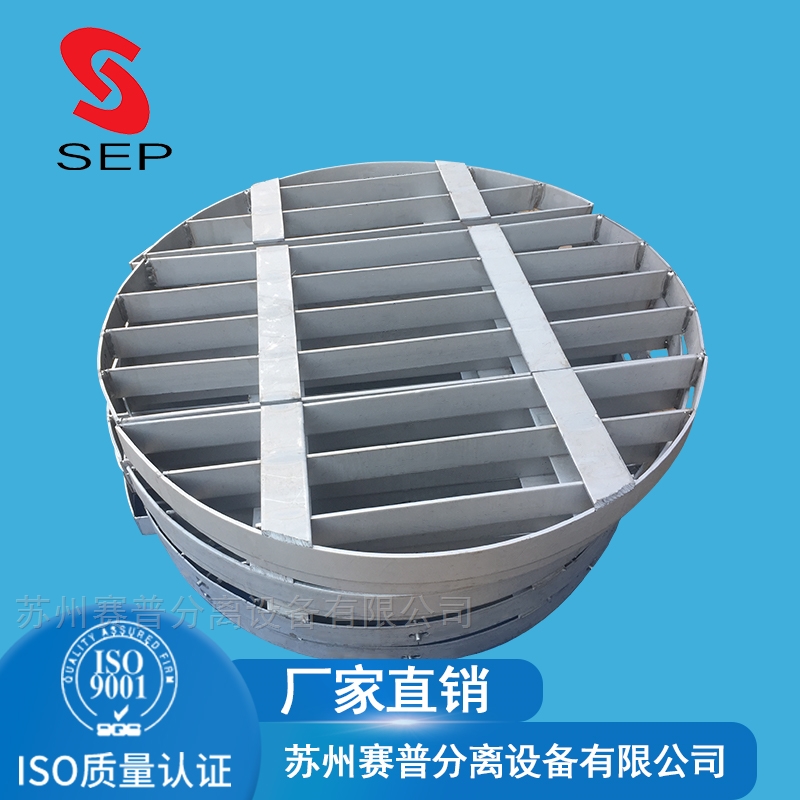 格栅式填料支承板上整齐排列大尺寸填料此法的另一好处是防止残渣沉积于底部,且便于塔的清洗。其次,小尺寸填料使用格栅式支承板时,栅条间的距离必定很小,故空隙率也很小,支承区更容易被堵塞。故这种支承板不宜于支承小填料,最好用以支承公称直径不小于38mm或更大的填料。最后,这种支承板较之气体喷射式,填料更容易从空隙处漏下,特别对于环形填料,因相互间不会咬合在一起,更有此弊病。支承塑料填料时,要避免栅条边缘做成锐角,因为填料受压后会被挤入开口区并被锐边所切割,进而堵塞支承板。这种毛病,在操作温度较高时更易产生。